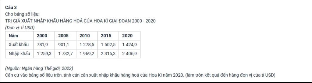 Căn cứ vào bảng số liệu trên, tính cán cân xuất nhập khẩu hàng hoá của Hoa Kì năm 2020. (làm tròn kết quả đến hàng đơn vị của tỉ USD)