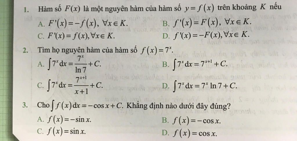 `color{red}\text{Câu 1:}`$\\$ Lý thuyết: Hàm số $F(x)$ được gọi là nguyên hàm của hàm số f(x) trên K nếu $F'(x) = f(x)$ với `AA x in K`$\\$ `color{red}{=>\text{Chọn C}}`$\\$ `color{red}\text{Câu 2:}`$\\$ `int \ 7^x\ dx=(7^x)/(ln7)+C`$\\$ `color{red}{=>\text{Chọn A}}`$\\$ `color{red}\text{Câu 3:}`$\\$ `int\ \sin x\ dx=-\cos x+C`$\\$`color{red}{=>\text{Chọn C}}`$\\$
