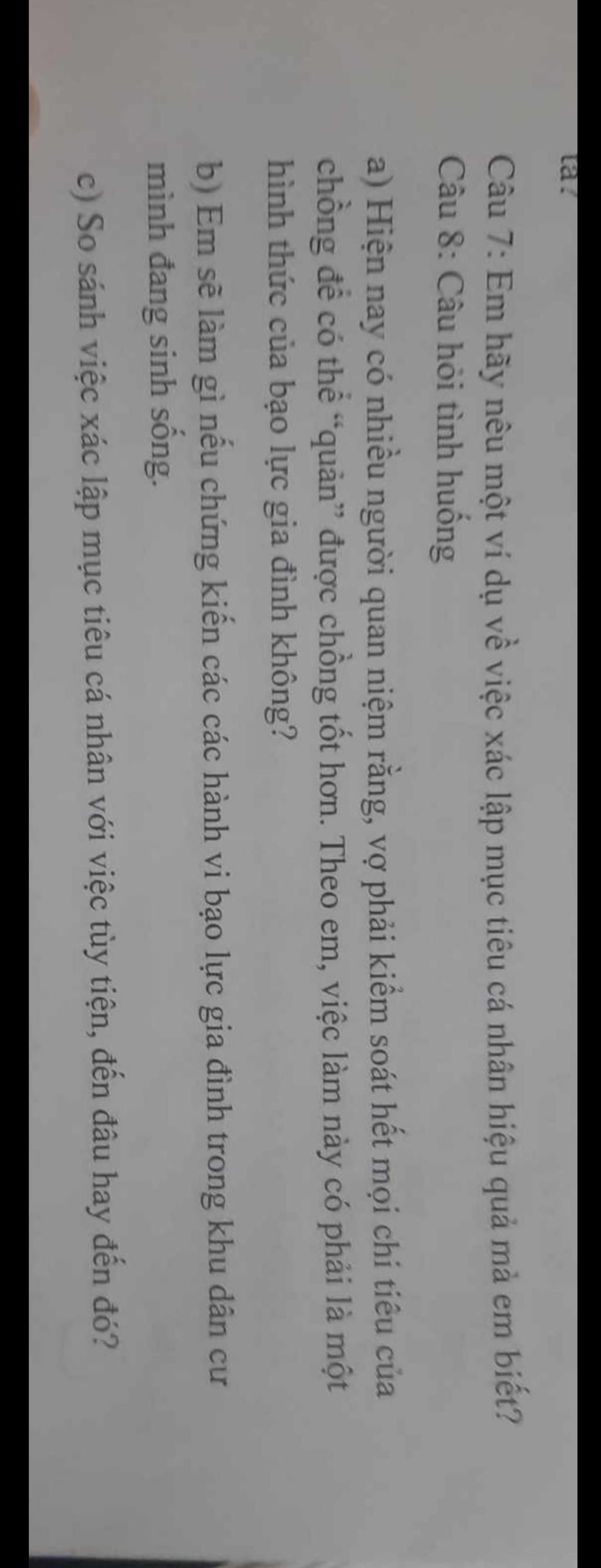 C.nếu chứng kiến việc bạo lực gia đình e sẽ đi báo với chính quyền địa phương và hô hào mọi người giúp đỡ can ngăn việc bạo lực đó. Rồi chính quyền sẽ vào cuộc để xử lí. Kêu gọi tuyên truyền chống bạo lực gia đình.