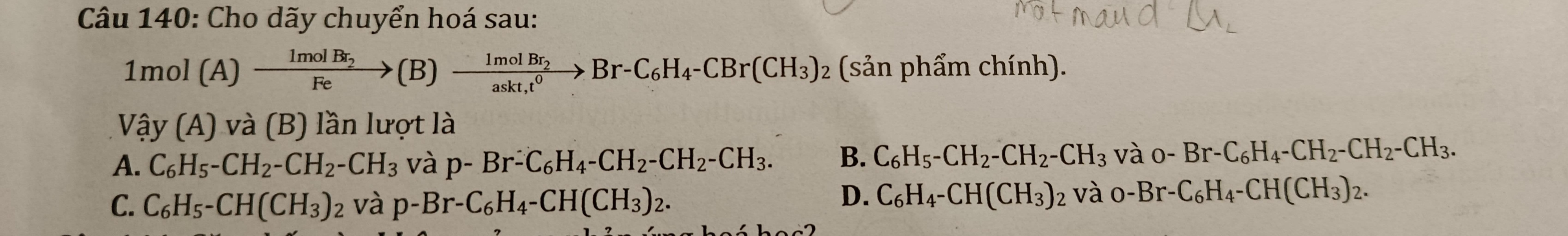 $p-Br-C_6H_4-CH(CH_3)_2+Br_2\xrightarrow{askt,t^o} p-Br-C_6H_4-CBr(CH_3)_2+HBr$