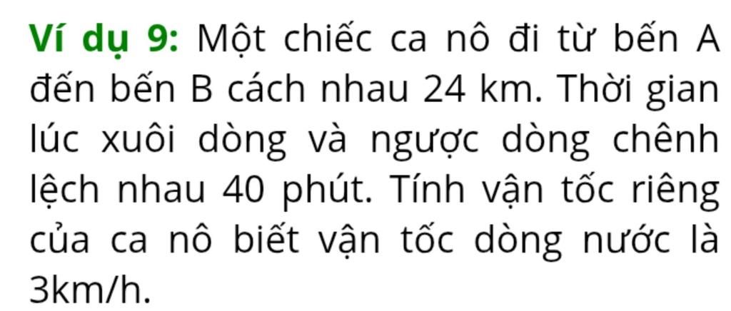 vì vận thời gian chênh lệch giữa xuôi dòng và ngược dòng là `40` phút nên ta có pt :
