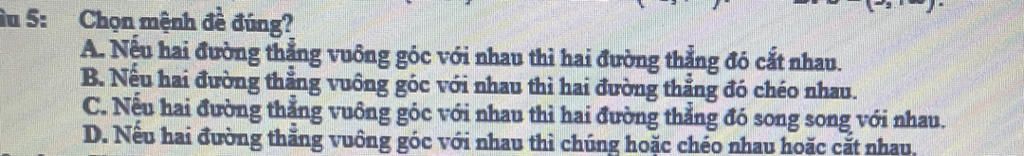 `A.Sai` ( Vì hai đường thẳng vuông góc với nhau có thể cắt nhau hoặc chéo nhau)