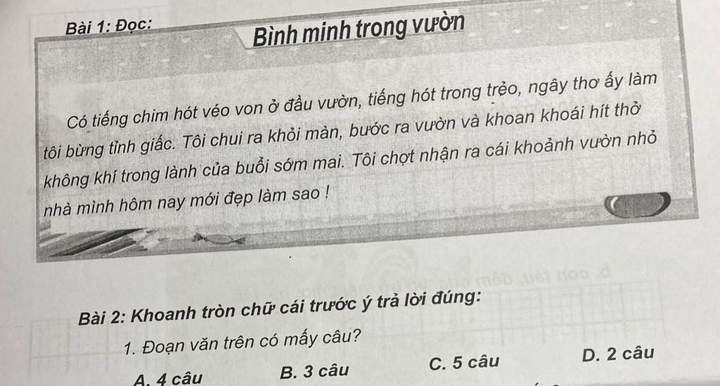 `-` Câu 2 : ''Tôi chui ra khỏi màn, bước ra vườn.... của buổi sớm mai. ''