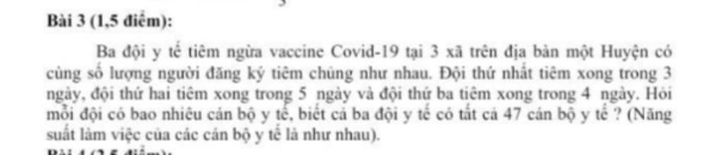 Gọi số cán bộ y tế của đội thứ nhất, đội thứ hai, đội thứ ba lần lượt là: `x`, `y`, `z` ( cán bộ y tế ) ( điều kiện: `x`, `y`, `z` $\in$ `N`* )