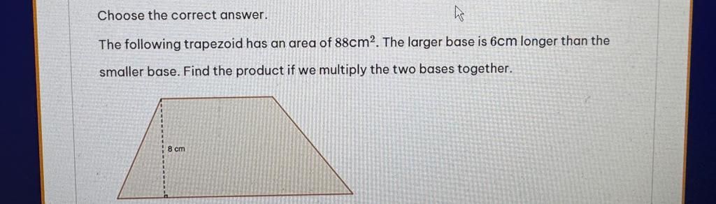 Dịch câu hỏi: Hình thang dưới đây có diện tích là `88 cm²`. Đáy lớn hơn đáy nhỏ `6 cm`. Tìm tích của hai đáy.