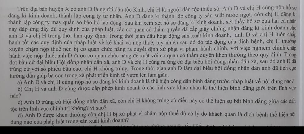 → Anh D và chị H đều được cơ quan nhà nước xem xét hồ sơ đăng ký kinh doanh theo quy định pháp luật, không phân biệt dân tộc. Điều này thể hiện sự công bằng trong việc đảm bảo quyền kinh doanh của công dân.