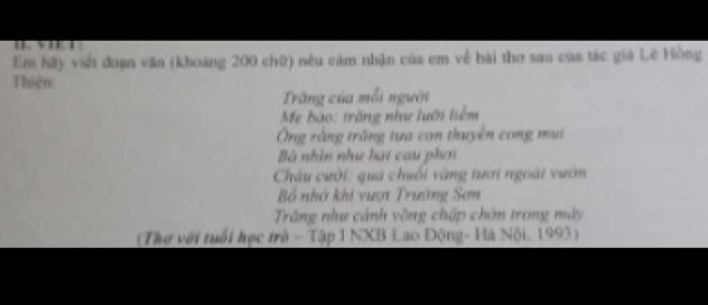 Bài thơ "Trăng của mỗi người" của Lê Hồng Thiện gợi lên những hình ảnh thân thuộc, gần gũi về vầng trăng trong ký ức mỗi con người. Mỗi câu thơ là một cách cảm nhận khác nhau về trăng, gắn liền với những kỷ niệm, những con người và hoàn cảnh riêng biệt. Người mẹ ví trăng như "lưỡi liềm", thể hiện hình ảnh trăng khuyết giản dị, gắn liền với lao động. Ông lại nhìn trăng như "con thuyền cong mái", vừa thơ mộng vừa gợi sự trầm tư. Với bà, trăng nhỏ bé như "hạt cau phơi", một hình ảnh thân thương của làng quê Việt Nam. Còn trẻ thơ lại hồn nhiên, vui tươi khi liên tưởng trăng với "quả chuối vàng tươi ngoài vườn". Đặc biệt, hình ảnh trăng trong tâm trí người lính gắn liền với ký ức gian khổ nhưng kiên cường khi vượt Trường Sơn, mang đến cảm giác tự hào, xúc động. Câu kết "Trăng như cánh võng chập chờn chìm trong mây" vừa gợi sự bồng bềnh, huyền ảo, vừa thể hiện nỗi nhớ nhung. Như vậy, bài thơ không chỉ tả trăng mà còn khắc họa những cung bậc cảm xúc, gắn trăng với mỗi số phận, cuộc đời, tạo nên một bức tranh giàu chất thơ và ý nghĩa nhân văn sâu sắc.