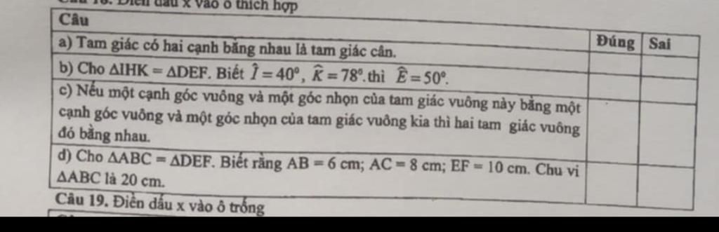 c) Một cạnh góc vuông và 1 góc nhọn này bằng 1 cạnh góc vuông và 1 góc nhọn của tam giác vuông kia vẫn chưa đủ điều kiện để chứng minh tam giác bằng nhau ( Trừ khi cạnh bằng nhau là cạnh huyền )