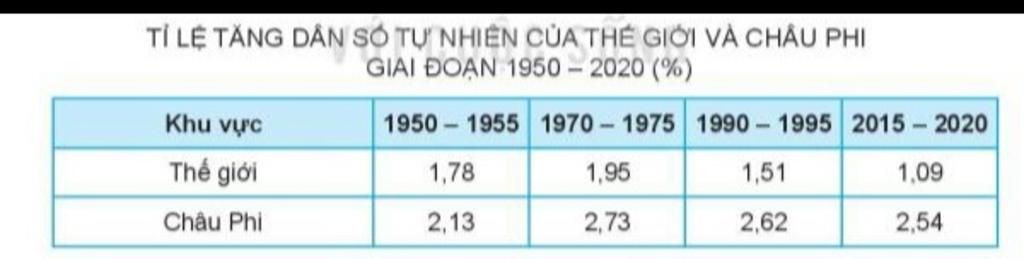 Câu b): Tính sự chênh lệch về tỉ lệ gia tăng dân số tự nhiên giai đoạn cao nhất so với giai đoạn thấp nhất ở châu Phi và thế giới?.