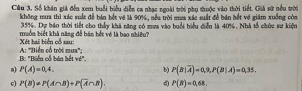 Câu 3. Số khán giả đến xem buổi biểu diễn ca nhạc ngoài trời phụ thuộc vào thời tiết. Giả sử nếu trời
