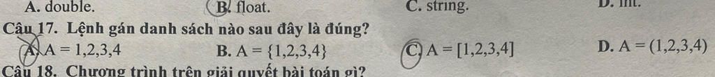 $\text{A. A = 1,2,3,4 (Đây là một tuple, không phải danh sách)}$ $\text{B. A = {1,2,3,4} (Đây là một set, không phải danh sách)}$ $\text{C. A = [1,2,3,4] (Đây là một danh sách hợp lệ trong Python) }$ $\text{D. A = (1,2,3,4) (Đây là một tuple, không phải danh sách)}$ $\text{đáp án là c}$