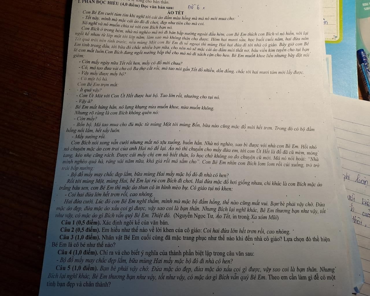 Trong đoạn trích có lời khen của cô giáo: "Coi hai đứa lớn hết trơn rồi, cao nhòng". Với tính từ '' cao nhòng'' được sử dụng đã miêu tả được vóc dáng cao và mảnh mai của bé Em và Bích. Từ lời khen của cô giáo, em hiểu rằng cả hai nhân vật "bé Em" và " Bích" đều đã lớn nhanh, trưởng thành hơn.