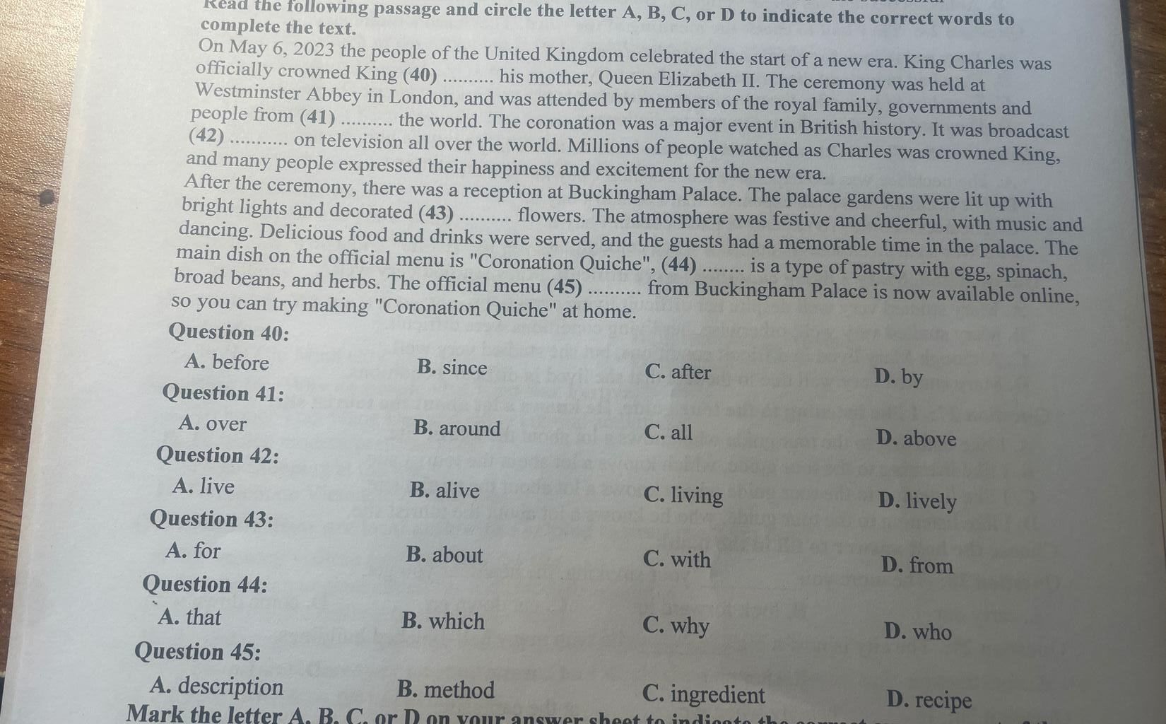 Giải thích: Câu này nói về việc vua Charles được lên ngôi sau khi mẹ ông, Nữ hoàng Elizabeth II, qua đời. "After" (sau khi) là từ phù hợp nhất để chỉ trình tự thời gian. Các lựa chọn khác: