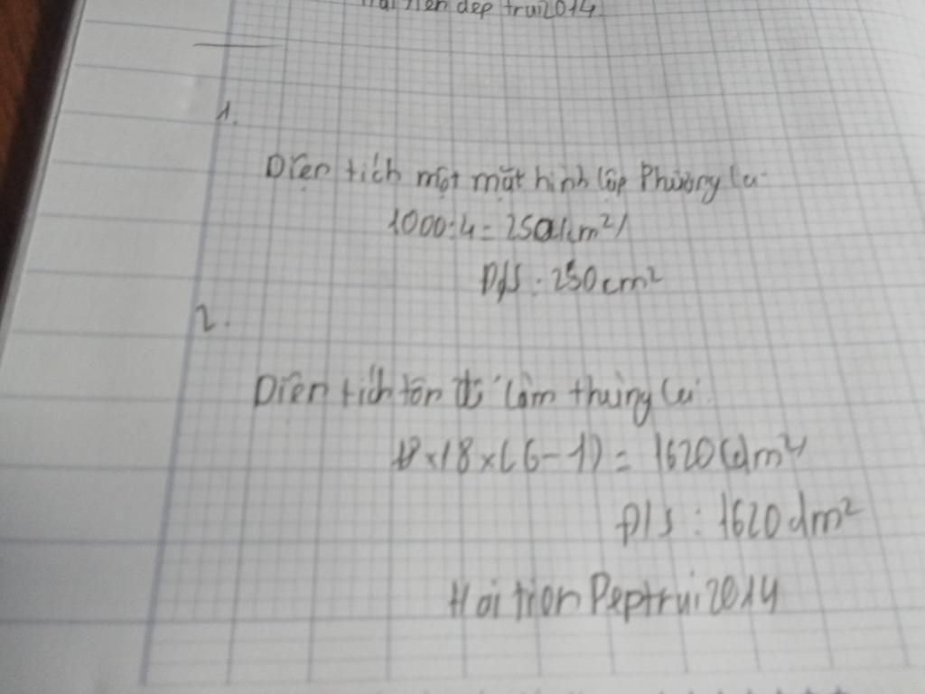 Một người thợ gò cái thùng tôn không nắp dạng hình lập phương có cạnh 18 dm . Hỏi diện tích tôn dùng để làm thùng ( không tính mép dán ) ?