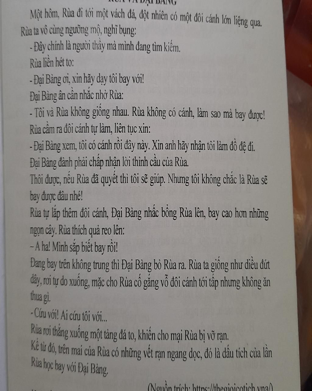 Cốt truyện ngụ ngôn khá đơn giản, câu chuyện kể về việc một chú rùa luôn khát khao được bay lên trên không trung để tận hưởng những điều mới mẻ, thú vị giống như những chú chim trên bầu trời. Nó đã nhờ một chú đại bàng làm thầy dạy mình nhưng đại bàng từ chối. Rùa kiên quyết làm một đôi cánh giả để nhờ đại bàng dạy bay