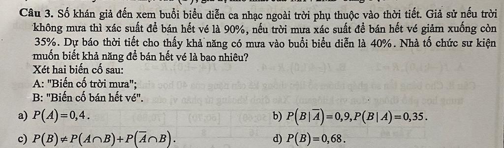 `*\text{Trời mưa nhưng vẫn bán hết vé tuy năng suất giảm:}P(B\text{\}A)=35%=0,35`