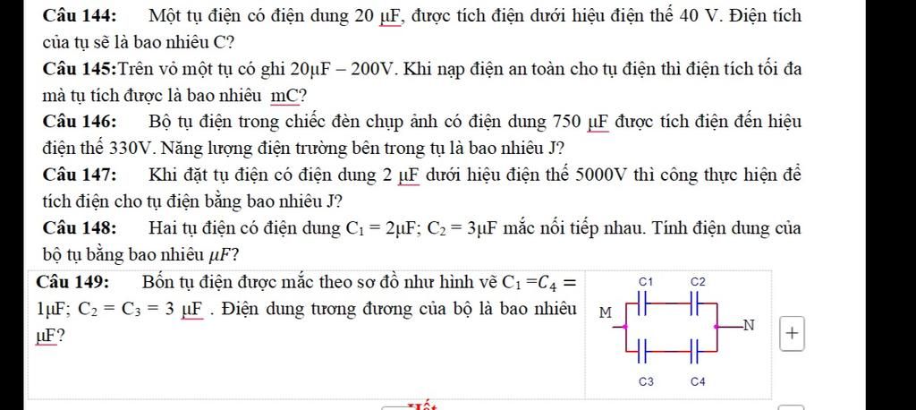 Câu 145:Trên vỏ một tụ có ghi 20uF — 200V. Khi nạp điện an toàn cho tụ điện thì điện tích tối đa