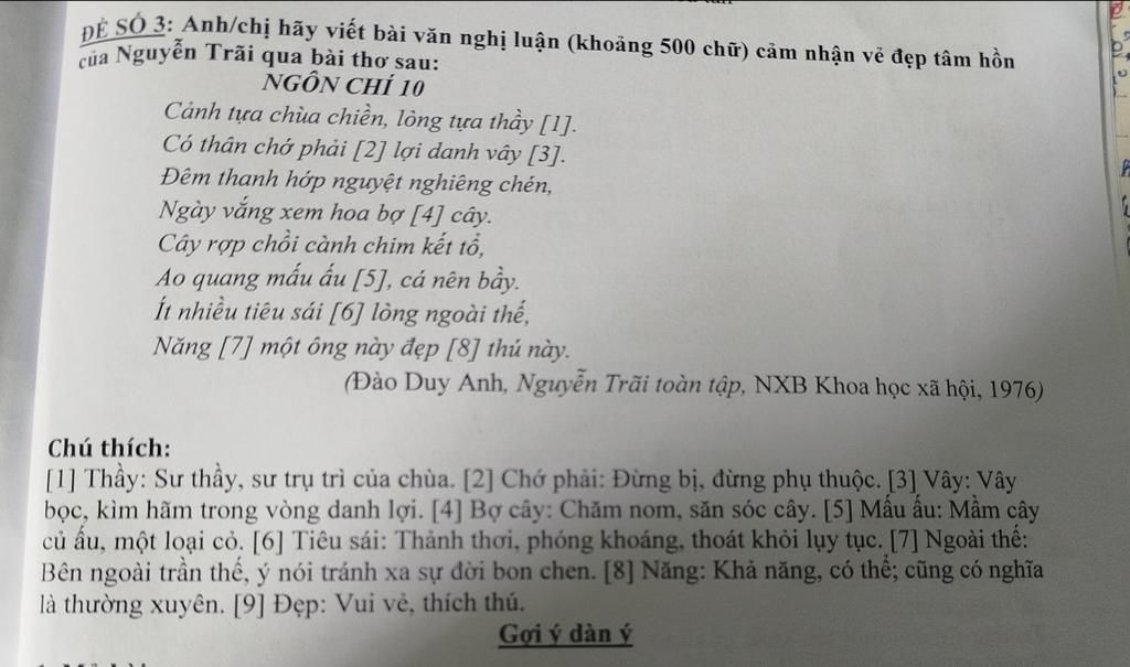 Nguyễn Trãi (1380-1442) là bậc đại thần tài ba, nhà thơ, nhà văn hóa lớn của dân tộc Việt Nam. Ông không chỉ có công lao to lớn trong sự nghiệp chống giặc Minh mà còn để lại nhiều tác phẩm văn học sâu sắc, thể hiện tư tưởng và phong thái của một bậc hiền triết. Bài thơ "Ngôn Chí 10" thuộc tập "Quốc Âm Thi Tập", là một trong những sáng tác thể hiện rõ tâm hồn thanh cao, yêu thiên nhiên và triết lý sống ẩn dật của Nguyễn Trãi. Qua bài thơ, ta thấy được một con người có nhân cách lớn, luôn hướng về cuộc sống giản dị nhưng đầy ý nghĩa..