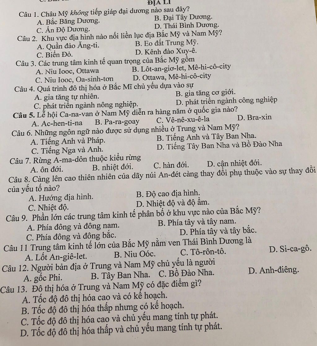 `-` Ngôn ngữ chính ở Trung và Nam Mỹ là tiếng Tây Ban Nha và Bồ Đào Nha thuộc hẹ La-tinh.