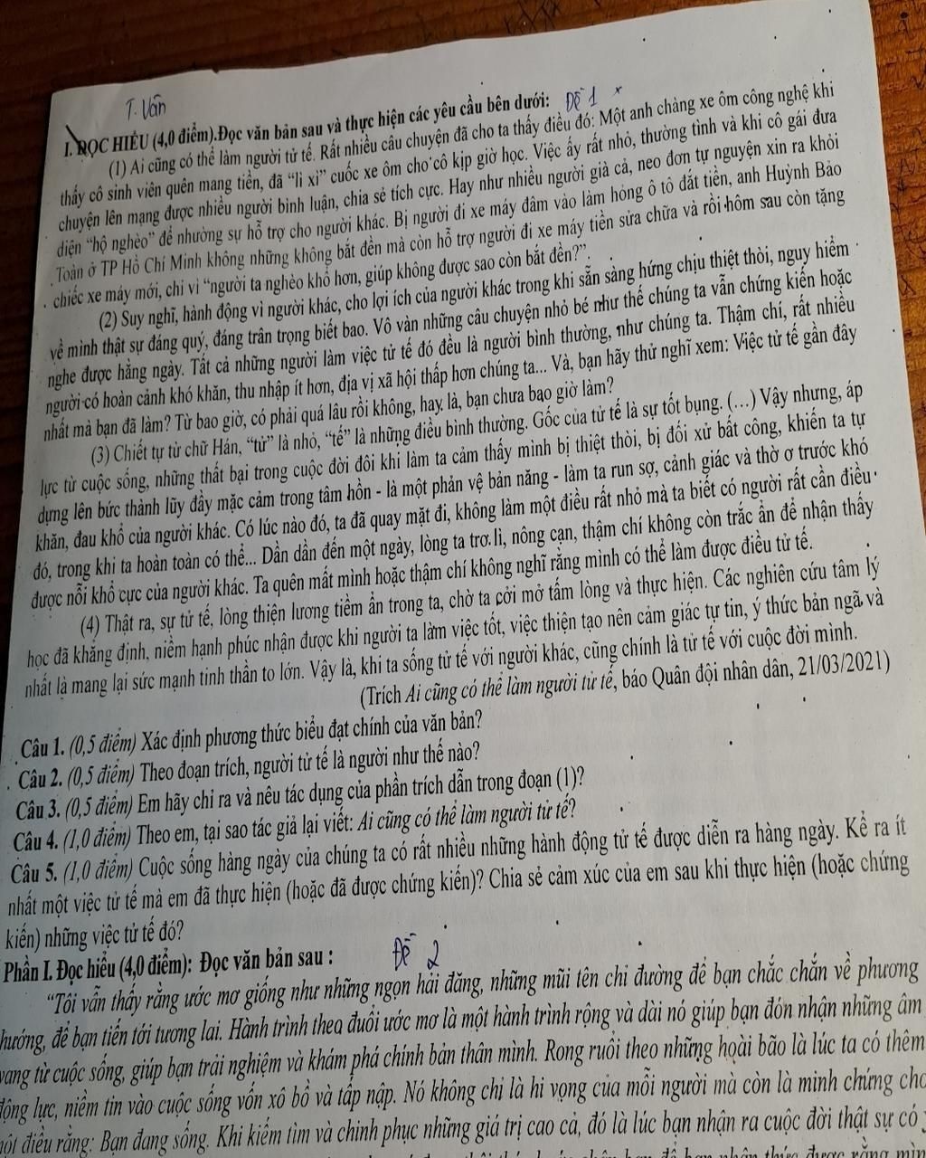 Câu 5 (1.0 điểm): Cuộc sống hàng ngày của chúng ta cần những hành động tử tế được diễn ra hằng ngày. Kể ra ít nhất 2 việc làm thể hiện sự tử tế. Chia sẻ cảm xúc của em sau khi thực hiện những việc ấy.