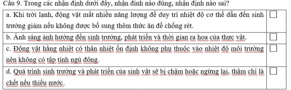 c) Sai. Vì động vật dùng nhiệt để giữ ấm cơ thể, nhưng chúng vẫn có thể ngủ đông để tiết kiệm năng lượng.