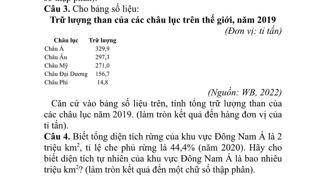 Câu 3 tổng trữ lượng than của các châu lục năm 2019: