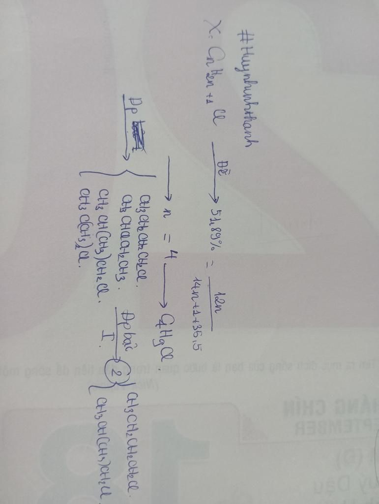 CTTQ của X là: `C_nH_{2n+1}Cl`