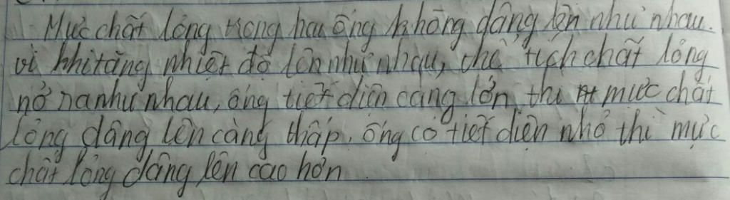 vì nhiệt kế của hai diện tích tăng như nhau, ông thủy tinh có diện tích nhỏ hơn thì dâng cao hơn, còn bầu có thể tích lớn hơn thì tăng chậm hơn