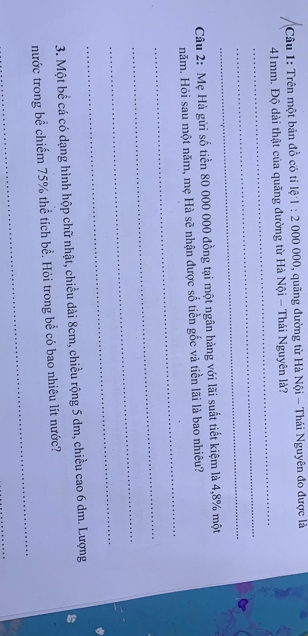 Câu 1: Trên một bản đồ có tỉ lệ 1 : 2 000 000, quãng đường từ Hà Nội – Thái Nguyên đo được là
