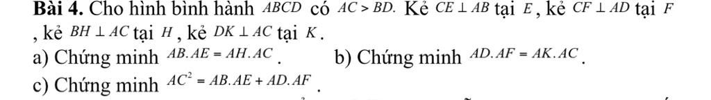 Bài 4. Cho hình bình hành ABCD có AC > BD. Kẻ CE LAB tại E, kẻ CF L AD tại F