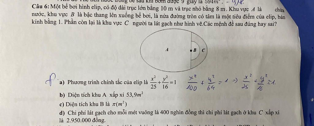 Câu 6: Một bể bơi hình elip, có độ dài trục lớn bằng 10 m và trục nhỏ bằng 8 m. Khu vực A là
