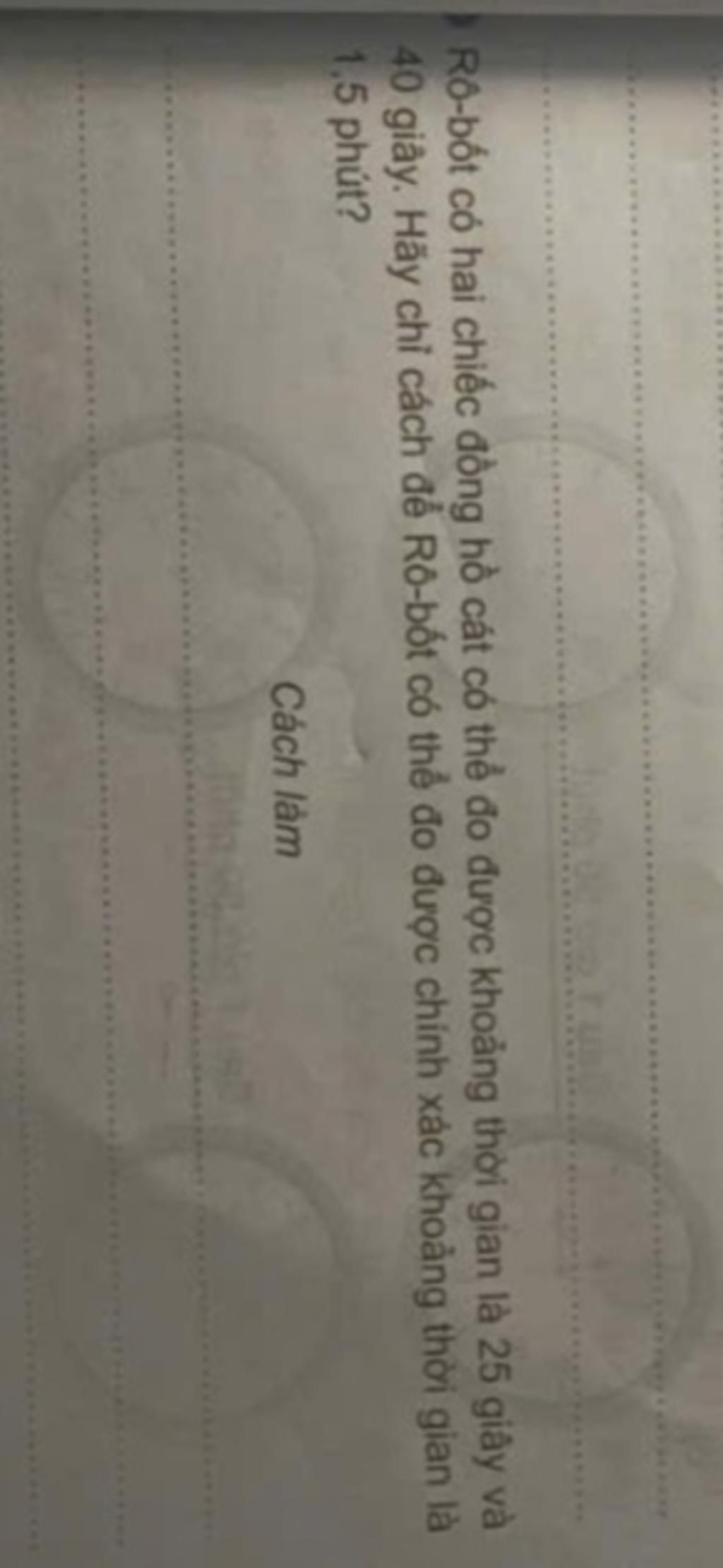 Đáp số: để Rô-bốt đo được chính xác 1,5 phút thì cần 1 lần đo đồng hồ 40 giây và 2 lần đồng hồ 25 giây