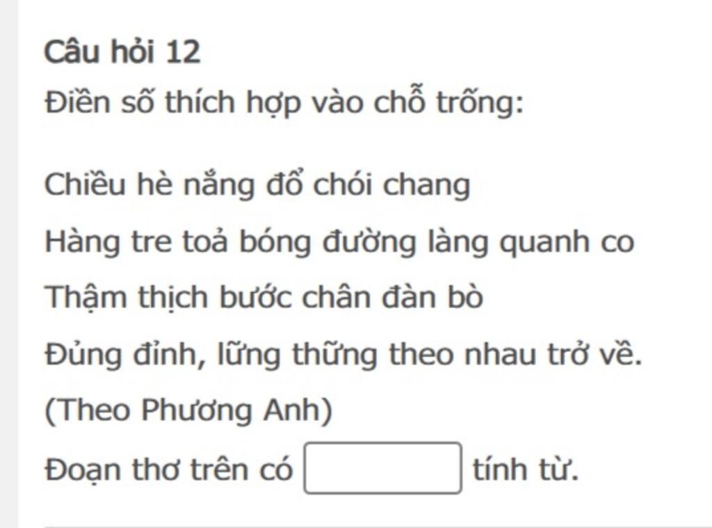 Các tính từ có trong đoạn thơ trên là: chói chang,quanh co, thậm thịch, đủng đỉnh, lững thững