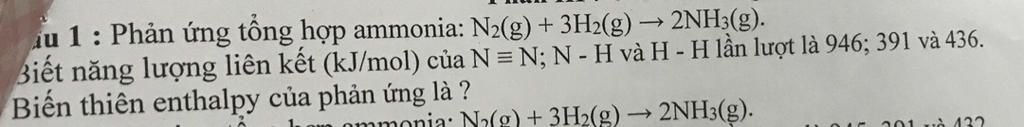 biết năng lượng liên kết (KJ/mol) của N=N; N-H và H-H lần lượt là 946; 391 và 436