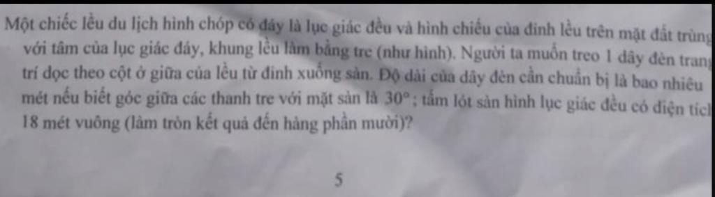 Một chiếc lều du lịch hình chóp có đáy là lục giác đều và hình chiếu của đỉnh lều trên mặt đất trùng với tâm của lục giác đáy, khung lều làm bằng tre (như hình). Người ta muốn treo I dây đèn trang trí dọc theo cột ở giữa của lều từ định xuống sàn. Độ dài của dây đèn cần chuẩn bị là bao nhiêu mét nếu biết góc giữa các thanh tre với mặt sàn là 30°; tấm lót sàn hình lục giác đều có diện tích 18 mét vuông (làm tròn kết quả đến hàng phần mười)?