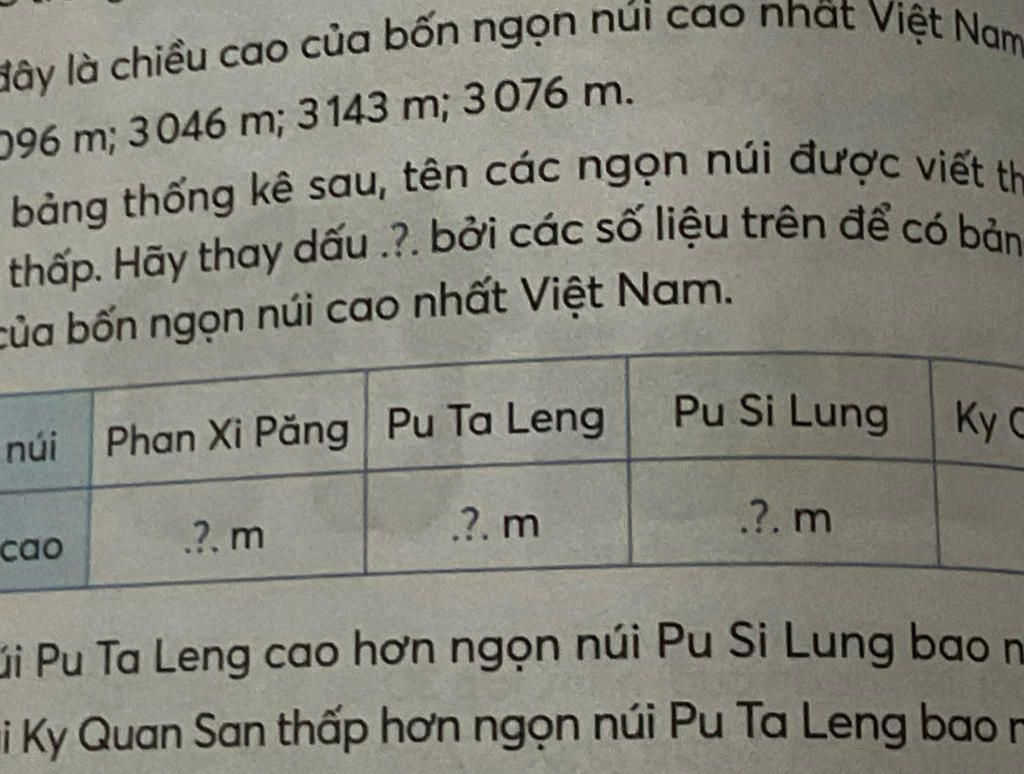 bảng thống kê sau, tên các ngọn núi được viết th