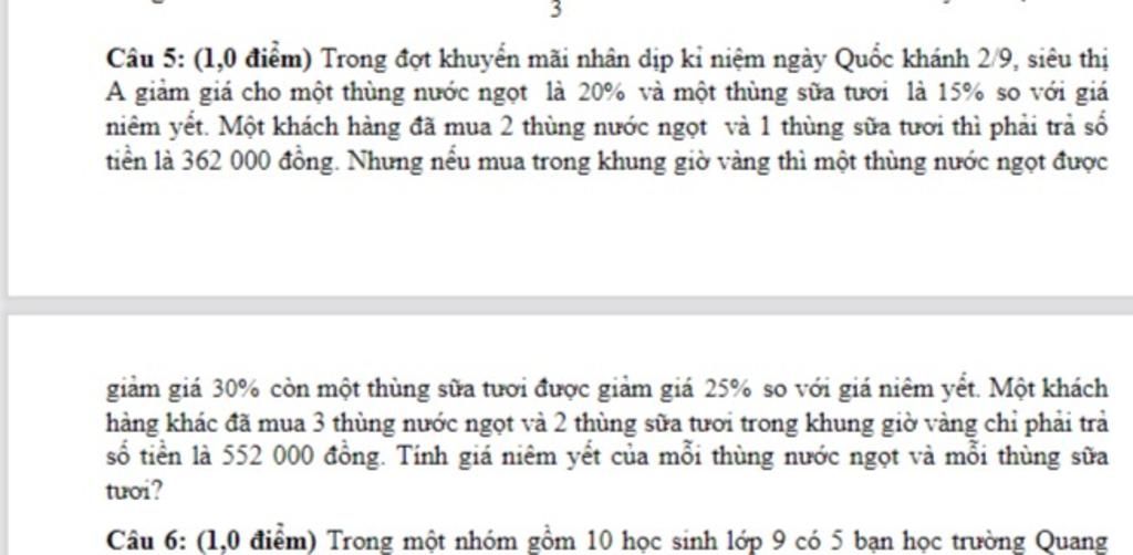 Đáp án: $1$ thùng nước ngọt: $ 120000$ đồng, $1$ thùng sữa tươi: $200000$ đồng