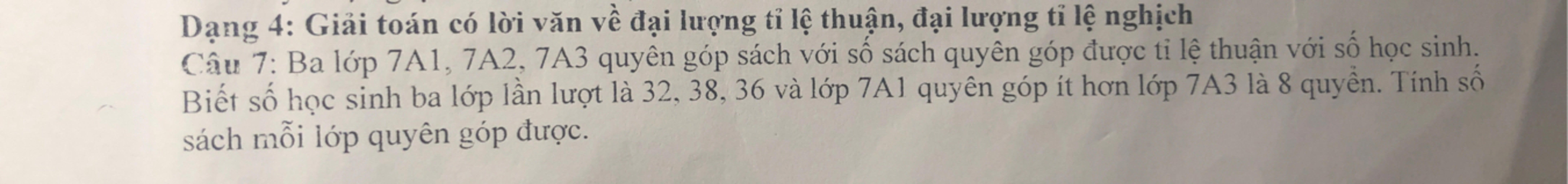 Vậy số sách `3` lớp `7A1,7A2,7A3` quyên góp được lần lượt là `64` quyển `,76` quyển và `72` quyển