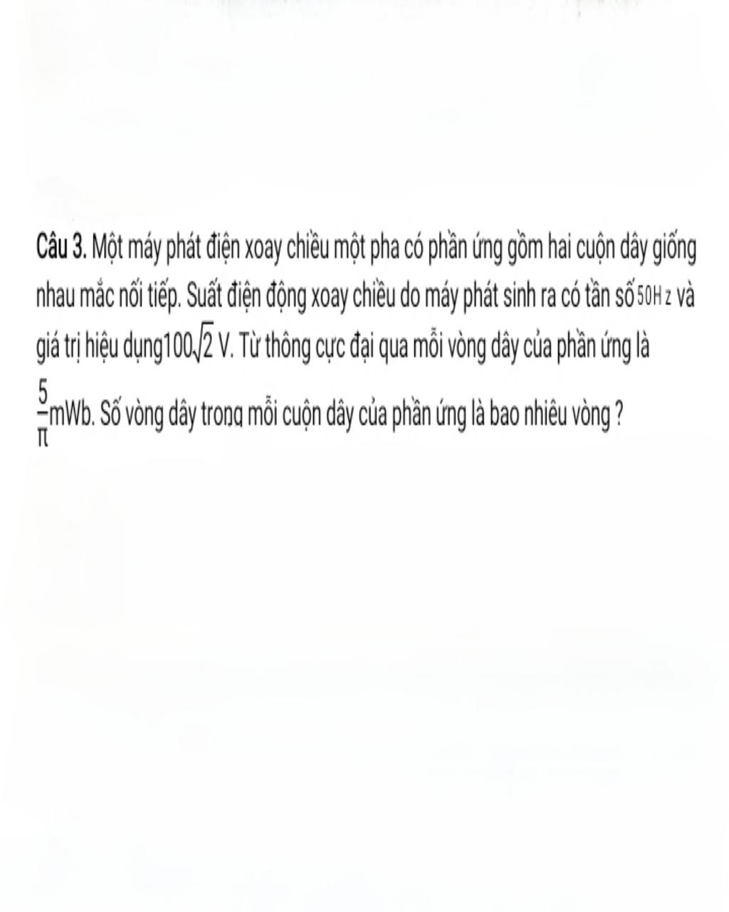 . Một máy phát điện xoay chiều một pha có phần ứng gồm hai cuộn dây giống nhau mắc nối tiếp. Suất điện động xoay chiều do máy phát sinh ra có tần số 50Hz và giá trị hiệu dụng100√2 V. Từ thông cực đại qua mỗi vòng dây của phần ứng là 5/π mWb . Số vòng dây trong mỗi cuộn dây của phần ứng là bao nhiêu vòng ?