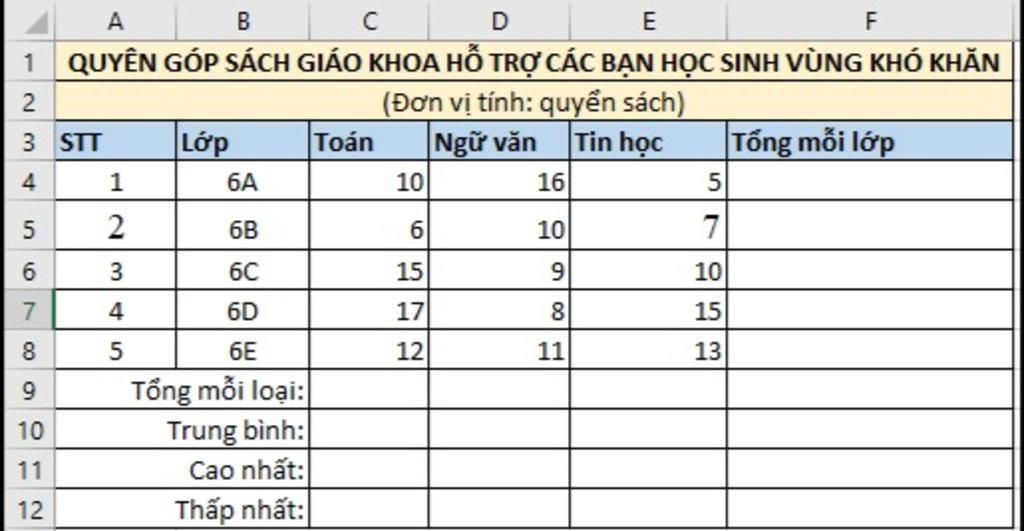 `star` Cách tính tổng số quyển sách quyên góp được của lớp 6A tại ô F4: =SUM(C4:D4:E4)