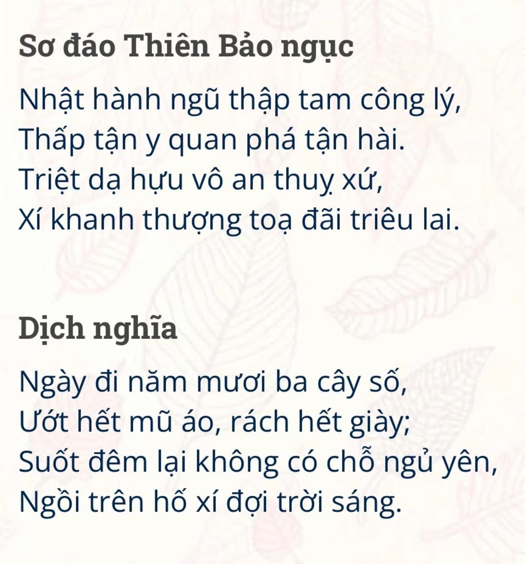 Tập thơ Nhật ký trong tù không chỉ là tác phẩm văn học mà còn là dấu ấn lịch sử quý giá, ghi lại những ngày tháng gian khổ trong ngục tù của Hồ Chí Minh. Trong đó, bài thơ "Sơ đáo Thiên Bảo ngục" đã khắc họa chân thực cuộc sống khó khăn, gian lao của người tù cách mạng, đồng thời thể hiện ý chí kiên cường và tinh thần lạc quan của tác giả.`