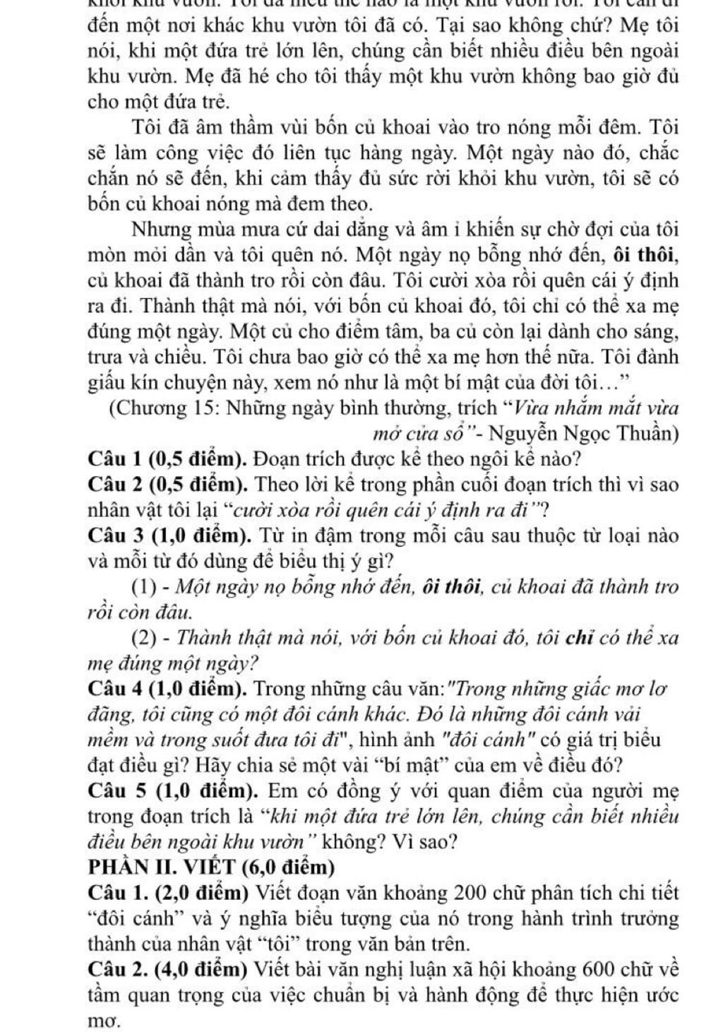 Câu 2 (0,5 điểm): Theo lời kể trong phần cuối đoạn trích, nhân vật "tôi" "cười xòa rồi quên cái ý định ra đi" vì sau khi nghĩ lại, nhân vật nhận ra rằng với bốn củ khoai đó, mình không thể xa mẹ lâu hơn một ngày. Điều này cho thấy sự gắn bó sâu sắc với mẹ và khu vườn, cũng như sự yếu đuối trong ý chí rời xa mẹ dù đã từng có ý định ra đi.