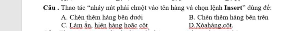 `-` Chèn thêm một hàng mới: Chọn hàng (dưới hàng muốn chèn). Nháy nút phải chuột vào chỗ chọn, chọn lệnh Insert.
