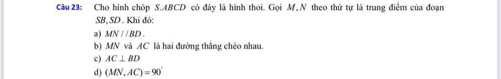 Cho hình chóp S.ABCD có đáy là hình thoi. Gọi M,N theo thứ tự là trung điểm của đoạn