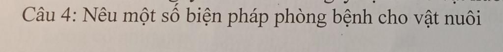 Biện pháp cơ bản để phòng bệnh cho vật nuôi: $\\$`+` Thường xuyên vệ sinh chuồng trại sạch sẽ, đảm bảo ba sạch: ăn sạch, ở sạch, uống sạch. $\\$`+` Đảm bảo mật độ chăn nuôi phù hợp. $\\$`+` Tiêm vắc xin đầy đủ và kịp thời. $\\$`+` Dùng thuốc để trị bệnh đúng thuốc, đúng thời điểm, đúng liều lượng.