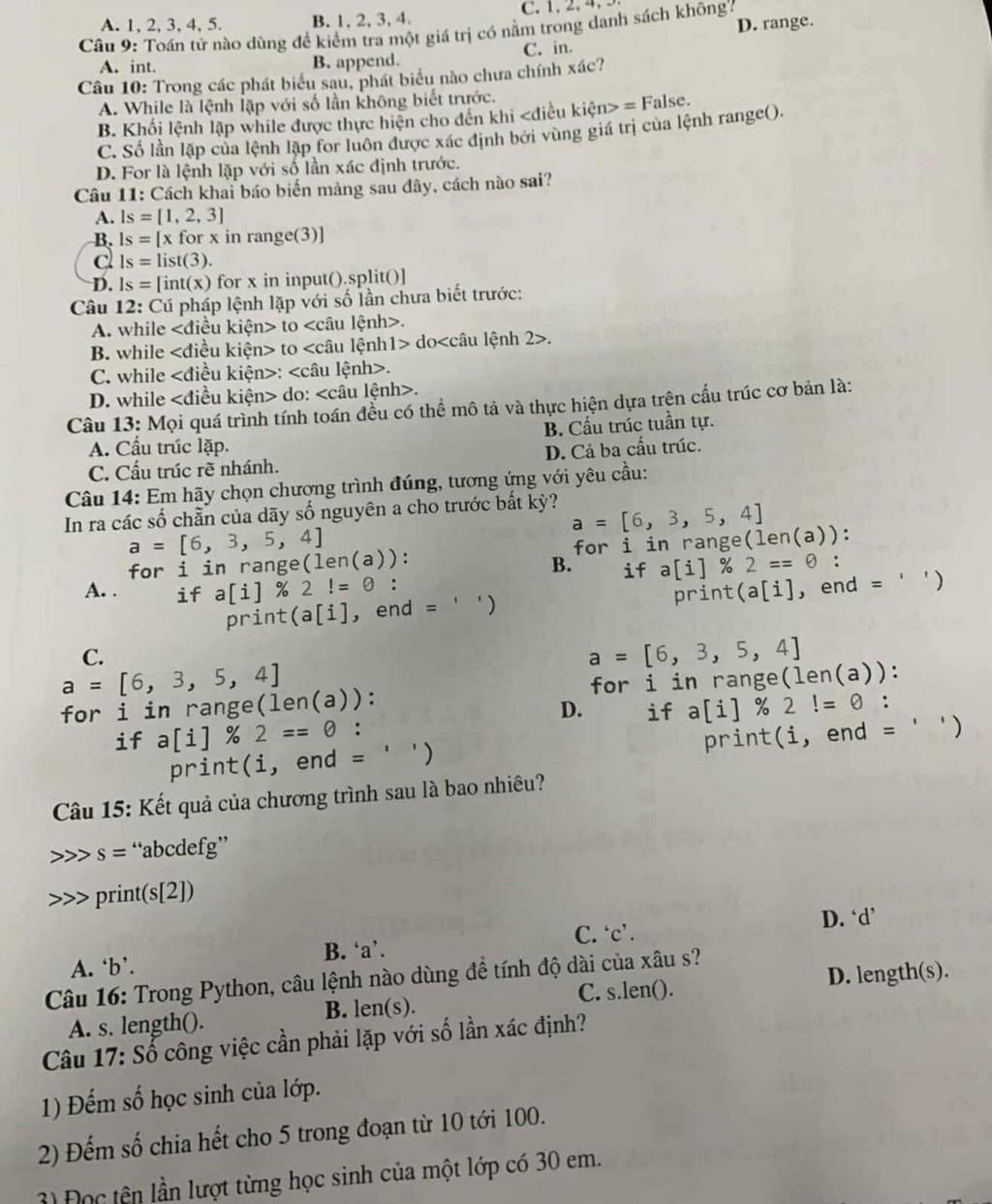 Câu 9: Toán tử nào dùng để kiểm tra một giá trị có nằm trong danh sách không?