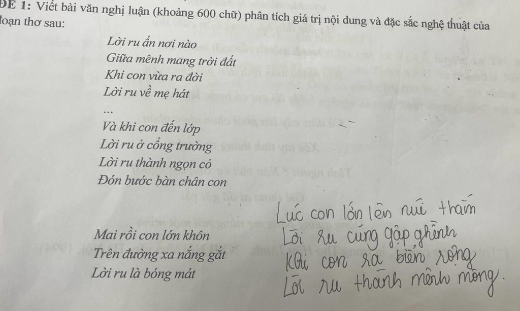 Lời ru của mẹ không chỉ bên con trong giấc ngủ hồng mà khi con lớn lên lời ru đã hiện hữu trong cuộc sống thường ngày. Hình ảnh "lời ru ở cổng trường" mang ý nghĩa biểu tượng. Lời ru theo con tới trường hay đó chính là sự dõi theo, lo lắng của người mẹ kho con bước vào môi trường mới. Trong mọi cột mốc trưởng thành con con luôn có mẹ dõi theo. với việc sử dụng biện pháp ẩn dụ "lời ru thành ngọn cỏ" đã thể hiện một hình ảnh đẹp. Những cây cỏ dại dẫu có nhỏ bé, tầm thường nhưng sức sống của nó thì bền bỉ. Trước mọi hoàn cảnh điều kiện ngọn cỏ đều vươn lên khỏi mặt đất cằn cỗi để xanh tốt. Tình yêu của mẹ dành cho con cũng giống như những cây cỏ, đó là một tình cảm dịu dàng, gần gũi và bền bỉ yêu thương. Đằng sau mỗi bước con đi luôn có hình bóng mẹ âm thầm bảo vệ và nâng đỡ. Tình cảm ấy lớn lao và tỏa bóng mát cho cuộc đời con. Mẹ ơi! Mẹ thật cao cả và thiêng liêng!