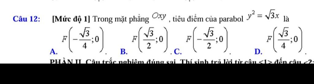 `->`Tiêu điểm `F(p/2,0)` hay `F(\sqrt3/4,0)`