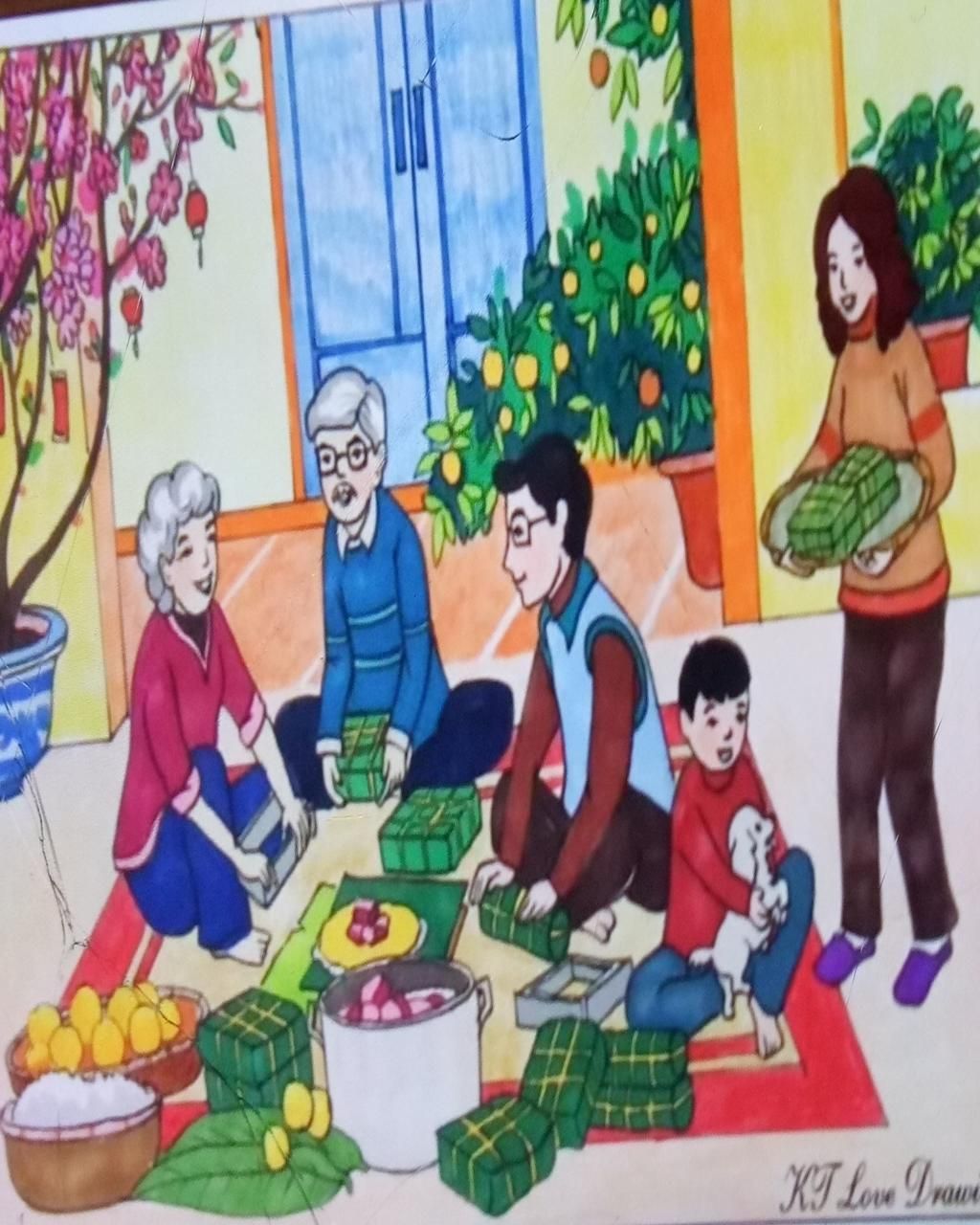 Sau khi gói xong, bánh được xếp vào nồi lớn để luộc trong suốt 8 - 10 tiếng. Trong lúc chờ bánh chín, cả nhà quây quần bên bếp lửa, kể cho nhau nghe những câu chuyện về ngày Tết xưa, những kỷ niệm thời thơ ấu. Không khí lúc ấy thật ấm cúng và hạnh phúc. Em cảm nhận được rằng, Tết không chỉ là dịp để vui chơi, mà còn là thời điểm để các thành viên trong gia đình xích lại gần nhau hơn, để tình thân được gắn kết bền chặt hơn.