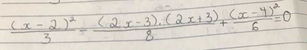`(x-2)^2/3 - ((2x-3)(2x+3))/8 + (x-4)^2/6=0`